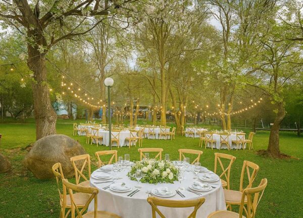 A charming venue surrounded by trees and open lawns, perfect for elegant outdoor dining or relaxed celebrations. The natural setting and soft lighting create a welcoming atmosphere for daytime events, social occasions, or special moments shared in nature.